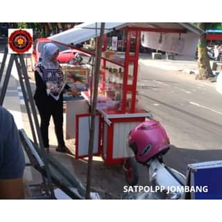 Anggota Satuan Polisi Pamong Praja Kabupaten Jombang saat sedang berusaha memberi peringatan kepada PKL yang enggan berpindah tempat dan tetap menempati tempat yang tidak semestinya.