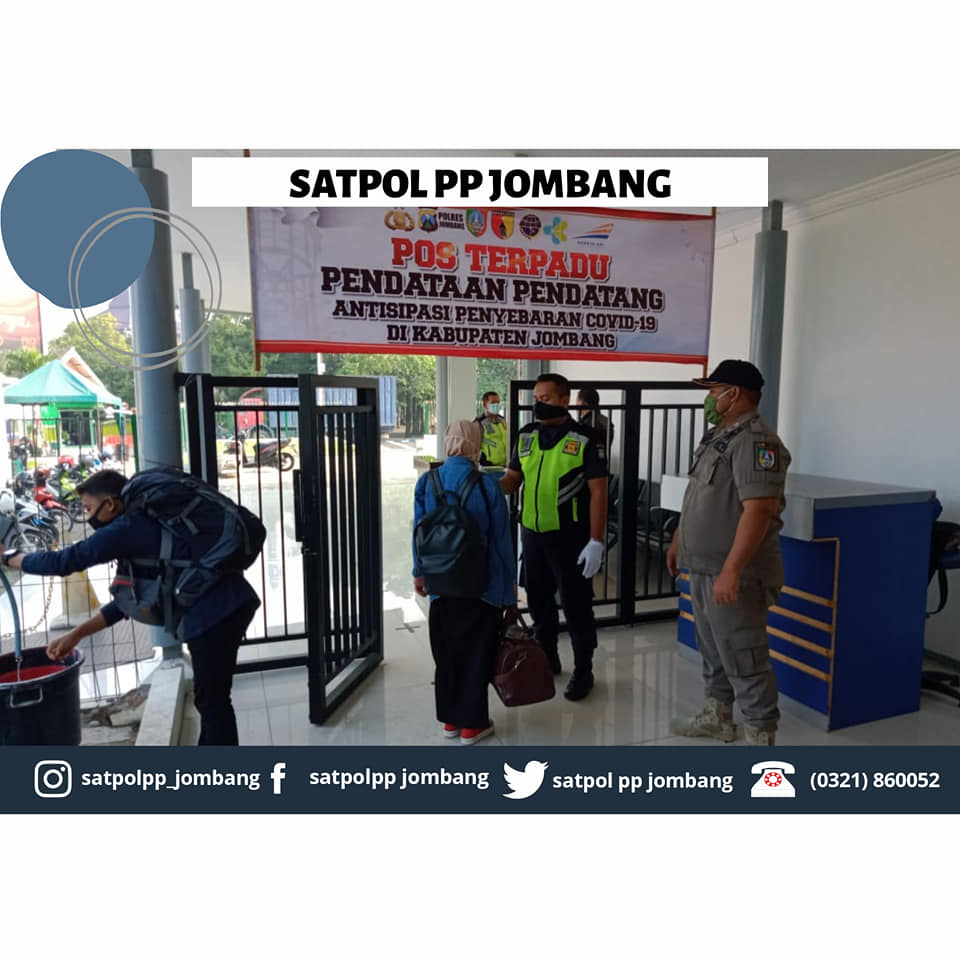 Anggota Satuan Polisi Pamong Praja melakukan giat pengamanan dan penjagaan kewaspadaan penyebaran Covid-19 di Stasiun Jombang kepada penumpang yang hendak naik maupun turun dari Kereta.