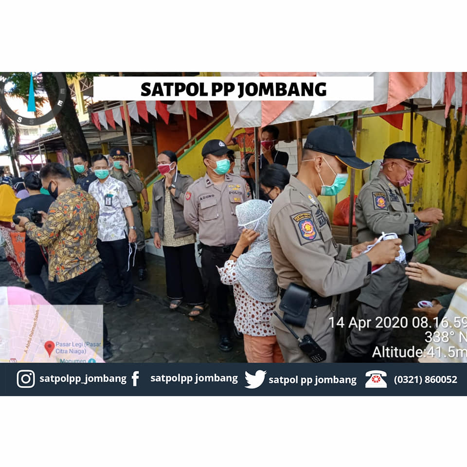 Selasa, 14 April 2020 Giat pengamanan Ibu Bupati dalam acara pembagian masker kepada pedagang dan pembeli di pasar Legi Jombang. Giat pengamanan di pimpin langsung oleh Kasatpol PP, Drs. Agus Susilo Sugioto dan Kabid Tibum & SDA Pol PP Jombang, Haris Aminuddin S.STP .