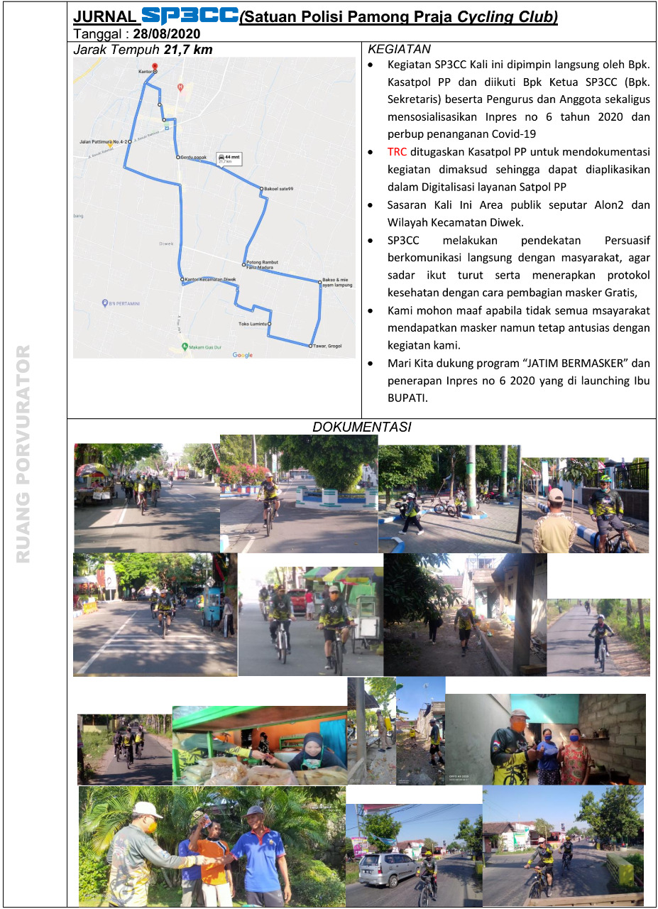 Mendukung program "JATIM BERMASKER" Pagi ini, SP3CC POL PP Jombang melakukan giat bagi bagi masker kepada masyarakat yang berkedapatan tidak menggunakan masker. Hal ini dilakukan untuk mencegah penyebaran Corona Virus Disease (Covid-19) diKabupaten Jombang. Kegiatan ini dipimpin langsung oleh Kasatpol PP. Kegiatan dilakukan dibeberapa titik kawasan Alun ALun Jombang kemudian menuju arah Kecamatan Diwek dan sekitarnya.